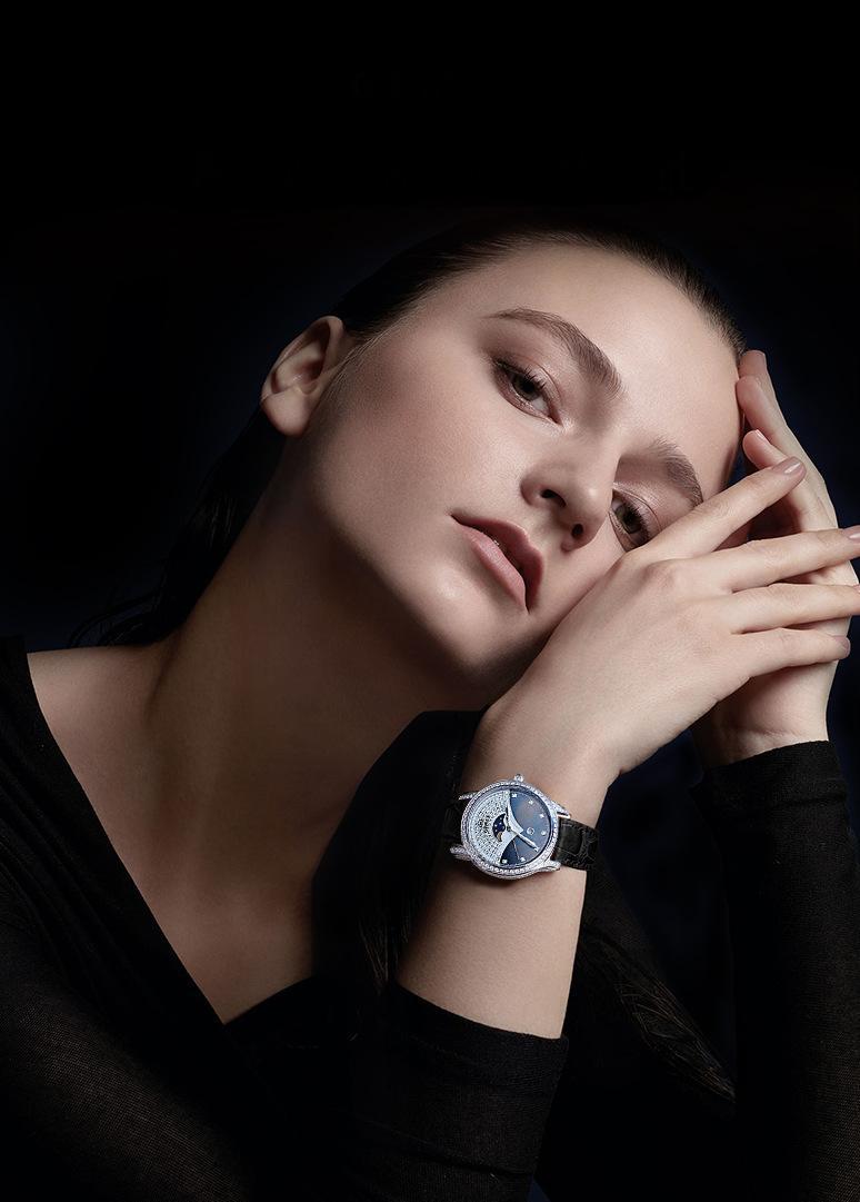 Equipped with a moon phase and calendar function, this watch combines practicality with a touch of romance. The 5ATM water resistance ensures that the watch is reliable in everyday situations, from washing hands to wearing in the rain or during light water activities.